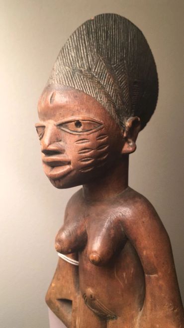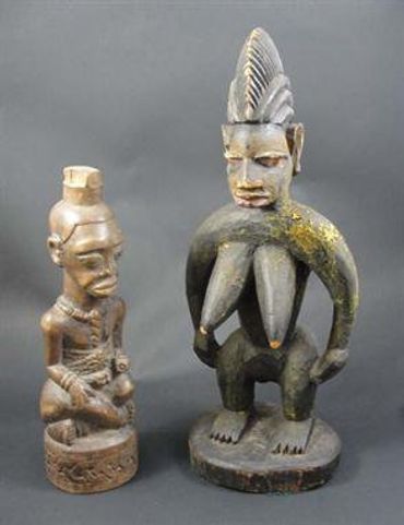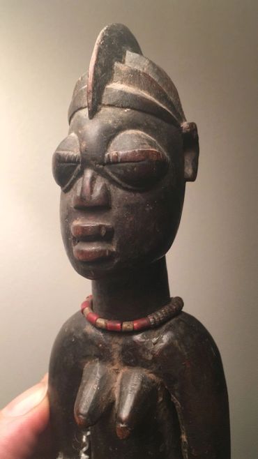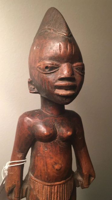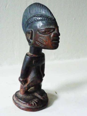 Ibeji are enormously variable, and entire volumes exist on how to nail down the origin of your ibeji to a couple of miles. In general terms they are short, squat figures about 6-12 inches (15-30cm) tall, with disproportionately large heads and complex coiffures. Their sex characteristics are usually well marked, and their legs are very short. They usually have some adornment, typically beads around the neck, waist and ankles/wrists. The figures are often shiny and featureless from generations of handling, and it is hard not to be moved at the thought of those long-dead hands caressing the figure and missing the child that it represented.