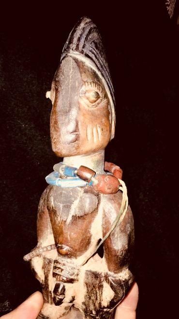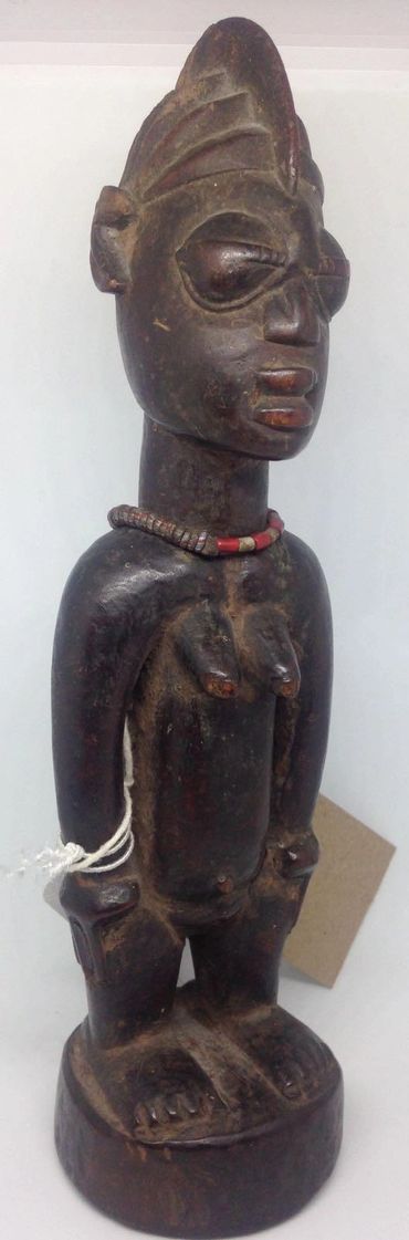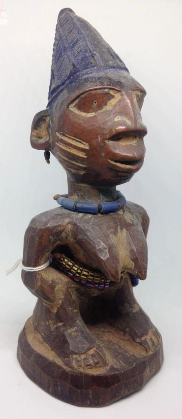 Twins are believed to be under the protection of an Orisha (spirit) named Shango, and in order to appease him and to keep a connection with the dead twin, the parents would visit a Babalawo (priest) who would commission a figure of the dead twin/s to be carved in the likeness of how they would have appeared as an adult. Only the sex is accurate to the deceased child, and the carver can take as many liberties as he likes with the appearance of the carving. It is then often dressed in flamboyant clothes, with cowrie shells, beads and coins, and carried about like a real child (tucked into the clothing) or placed on a household shrine. They are even 'fed' with metaphorical or real food, and many early figures' mouths are worn away from all the dinners they received from their families.
